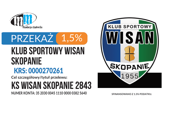 Jak co roku zwracamy się z prośbą do wszystkich sympatyków KS Wisan Skopanie o finansowe wsparcie naszej działalności. Trwa okres corocznego rozliczenia podatkowego, w związku z czym serdecznie zachęcamy do przekazania 1,5% swojego podatku na dalsze funkcjonowanie naszego Klubu.