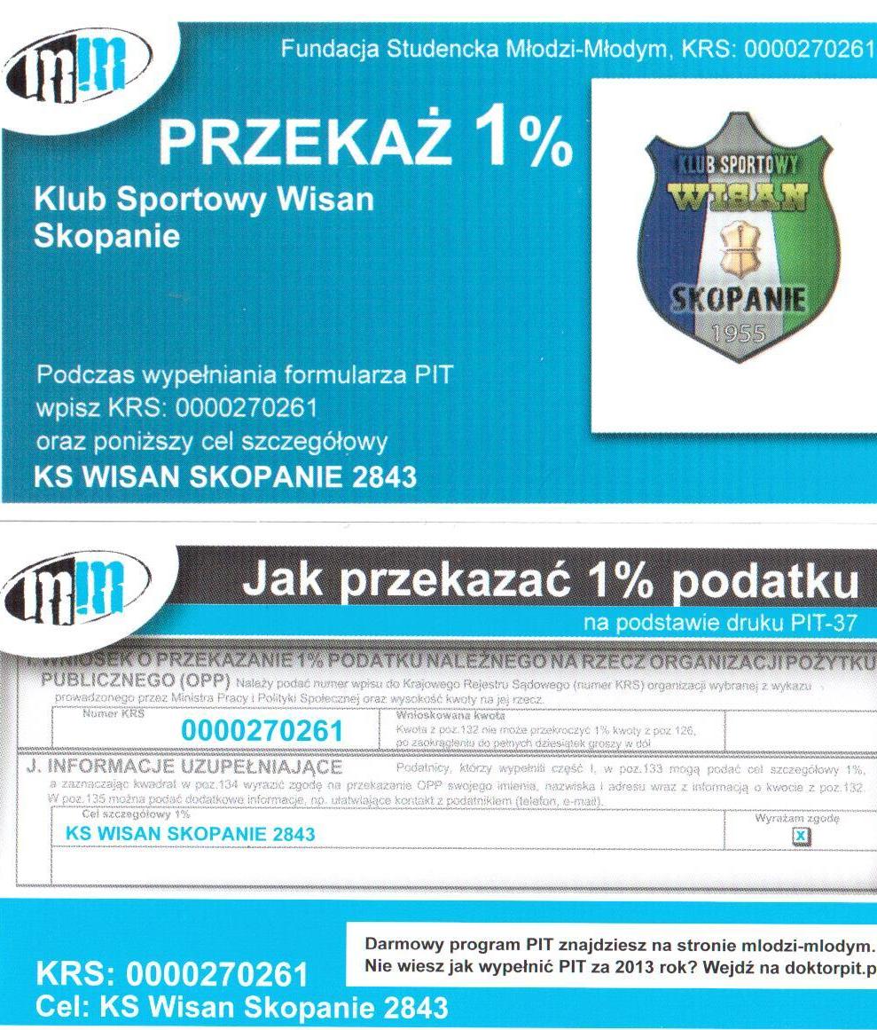 Zarząd Klubu Sportowego WISAN Skopanie pragnie podziękować wszystkim Darczyńcom, którzy w 2014r. przekazali swój 1% podatku na nasz klub.