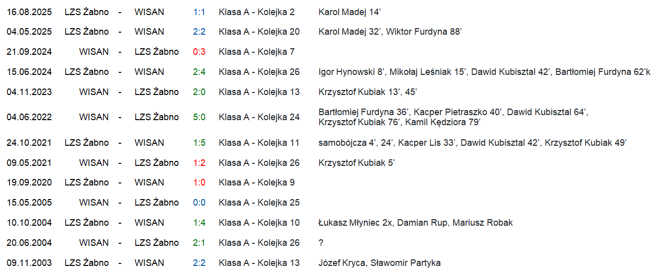 Niedzielne spotkanie będzie 14. meczem, które nasza drużyna rozegra z LZS Żabno w tym wieku. Nasza rywalizacja rozgorzała na nowo dopiero w ostatnich sześciu latach — wcześniej przez 15 lat nie było bezpośrednich starć. Spotkania te były zróżnicowane, zarówno pod względem wyników, jak i emocji. Historia pokazuje, że zdarzały się zarówno wysokie zwycięstwa (5:0, 5:1), jak i bolesne porażki (0:3), kilka meczów kończyło się też remisem lub minimalnym zwycięstwem jednej ze stron. Bilans przemawia na korzyść Wisanu, ale warto zauważyć, że kiedyś udało się nam wygrać z tym przeciwnikiem cztery razy z rzędu (lata 2021 — 2024), teraz natomiast notujemy serię trzech meczów bez zwycięstwa (2R, 1P).