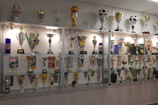 Nowa gablota z pucharami i proporczykami zawisła na korytarzu zmodernizowanego budynku hali sportowej w Skopaniu.