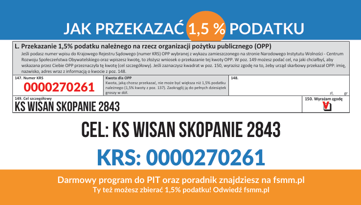 Jak co roku zwracamy się z prośbą do wszystkich sympatyków KS Wisan Skopanie o finansowe wsparcie naszej działalności. Trwa okres corocznego rozliczenia podatkowego, w związku z czym serdecznie zachęcamy do przekazania 1,5% swojego podatku na dalsze funkcjonowanie naszego Klubu.